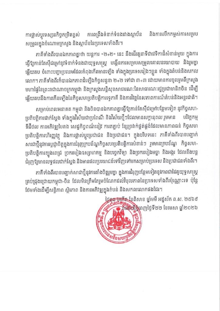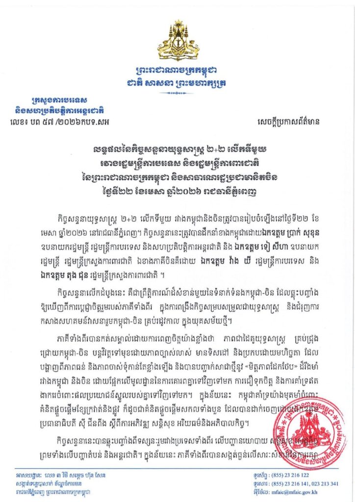ក្រសួងការបរទេស បង្ហាញពីលទ្ធផលនៃកិច្ចសន្ទនាយុទ្ធសាស្ត្រ ២+២ លើកទីមួយ រវាងរដ្ឋមន្ត្រីការបរទេស និងរដ្ឋមន្ត្រីការពារជាតិ ព្រះរាជាណាចក្រកម្ពុជា និងសាធារណរដ្ឋប្រជាមានិតចិន ថ្ងៃទី២២ ខែមេសា ឆ្នាំ២០២៦ រាជធានីភ្នំពេញ